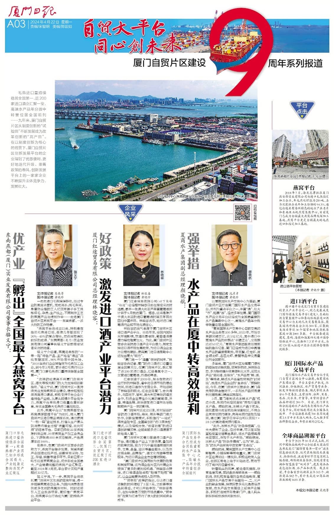 “廈門口岸毛燕進(jìn)口量持續(xù)穩(wěn)居全國(guó)第一;東南燕都產(chǎn)業(yè)園(燕安居(廈門)集團(tuán)旗下子公司)已初步形成全國(guó)最大、產(chǎn)業(yè)鏈最完整的燕窩產(chǎn)業(yè)匯聚”——摘至4月22日廈門日?qǐng)?bào)《廈門自貿(mào)區(qū)建設(shè)9周年系列報(bào)道》